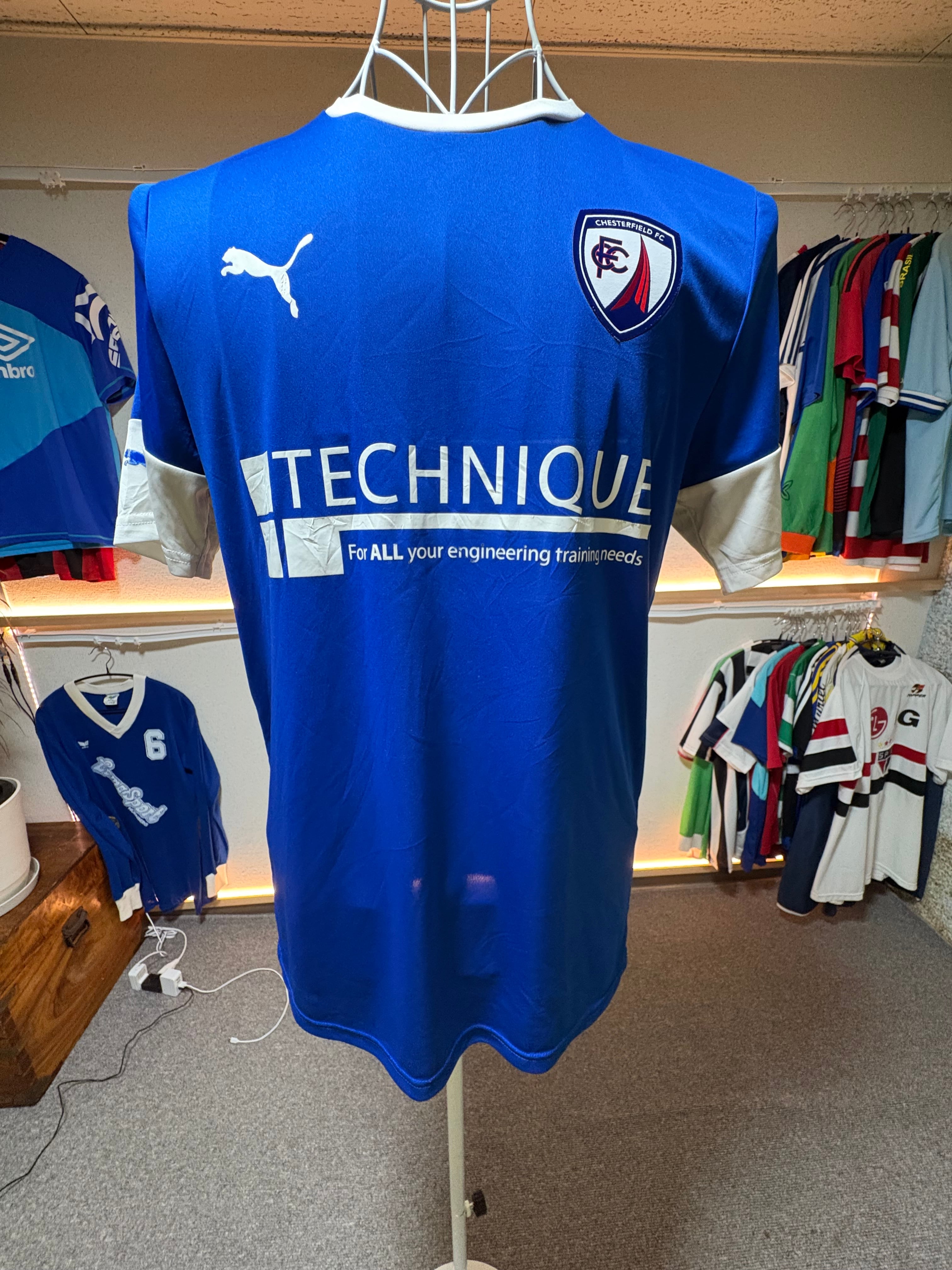 • クラブエンブレム:胸に「Chesterfield FC」と書かれた紺・白・赤のエンブレム。クラブの象徴である「Crooked Spire(曲がった尖塔)」が描かれています。