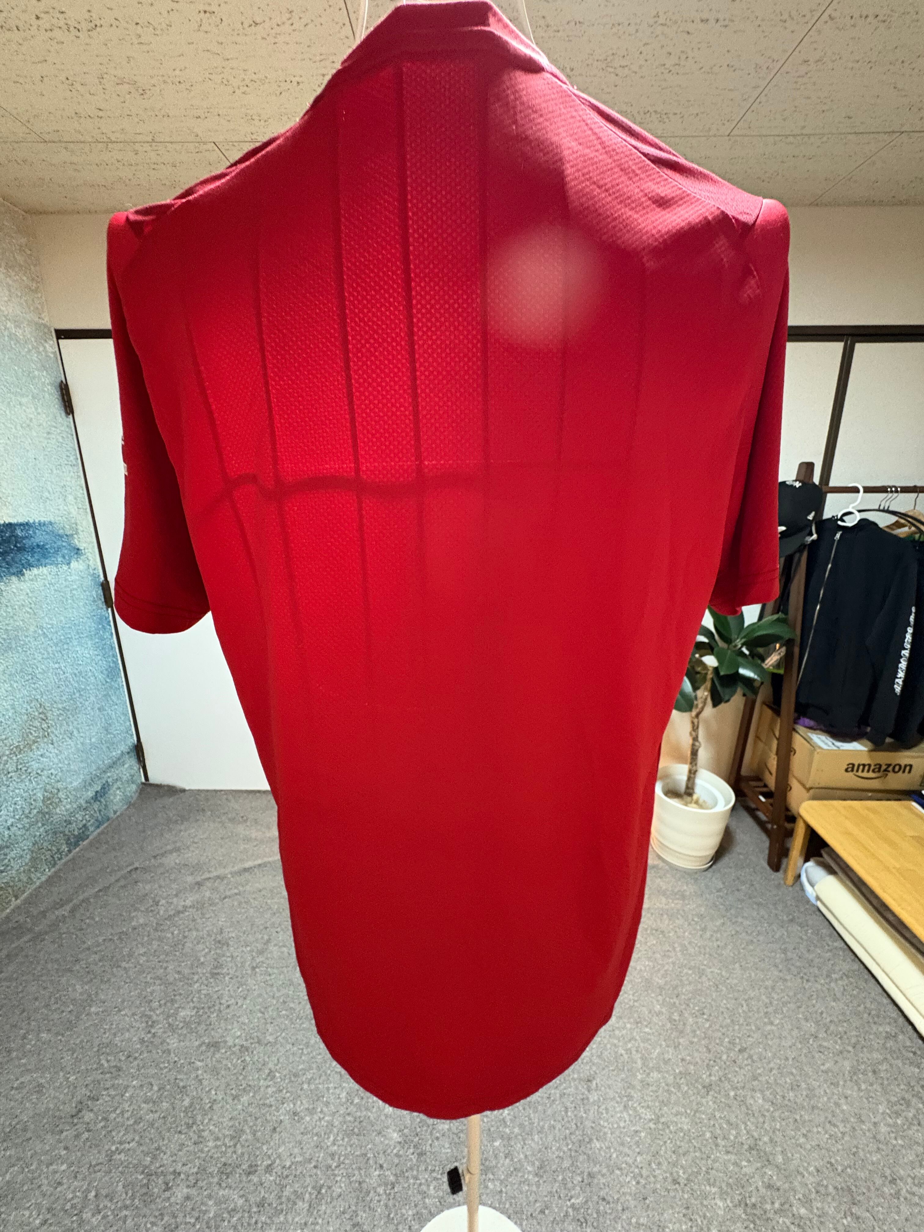 • デザイン:赤を基調にしたシャツで、幾何学模様(Y字を組み合わせたようなパターン)が全体に入っています。襟は濃紺のアクセントカラー。裾には「DRYCELL」の表記があり、プーマの吸汗速乾素材モデルです。