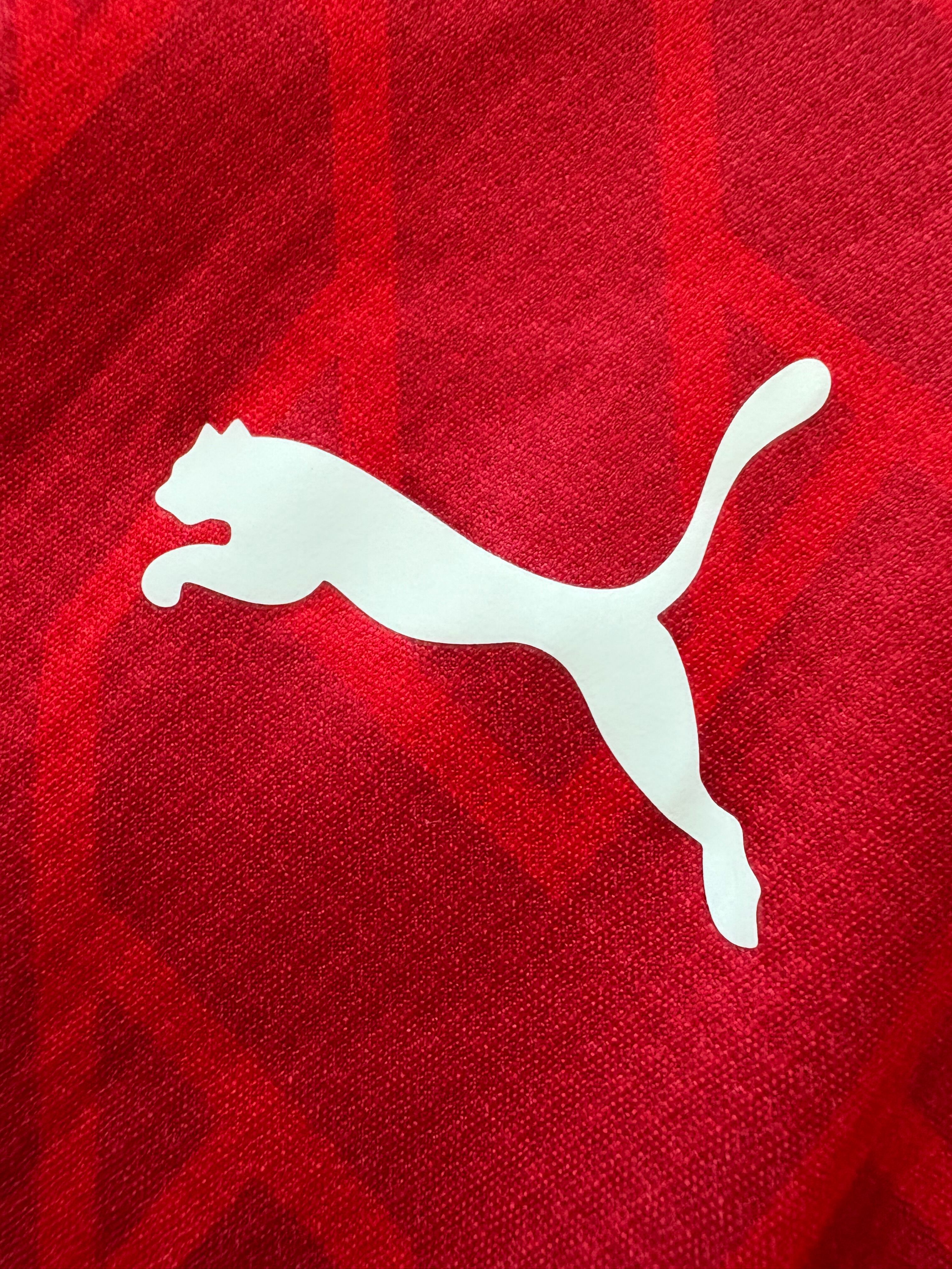 • Design: The shirt is primarily red, with an all-over geometric pattern (a pattern resembling an interlocking Y). The collar has a dark blue accent color. The hem has the word "DRYCELL" written on it, and the shirt is made from PUMA's sweat-absorbing, quick-drying material.