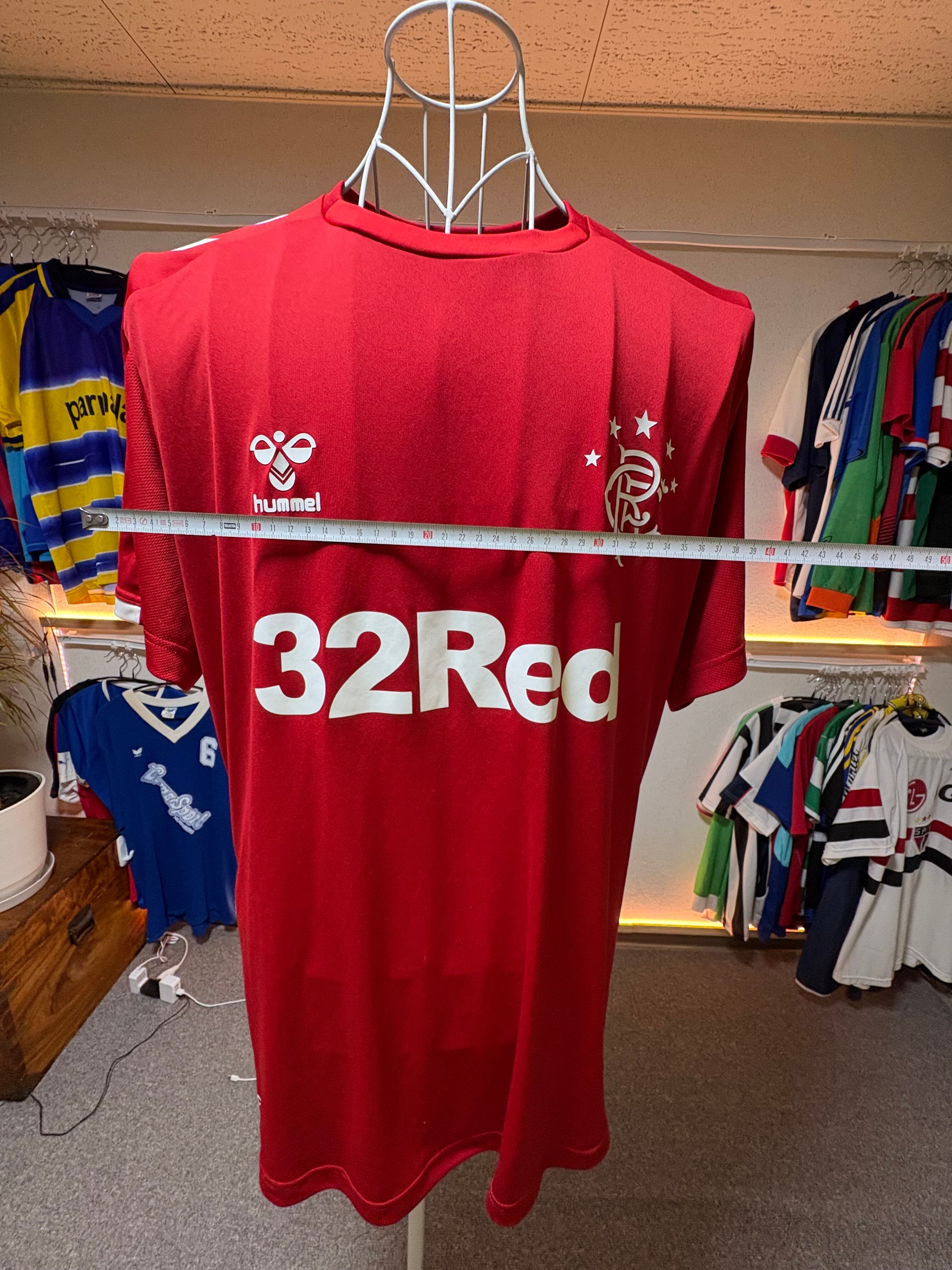 The club's anthem, "We Will Follow On," is printed on the bottom of the shirt. This comes from a chant sung by Rangers supporters.